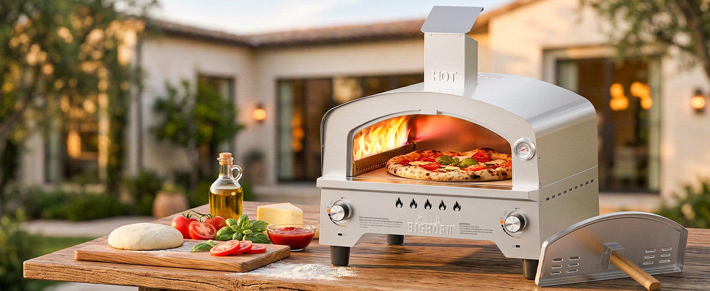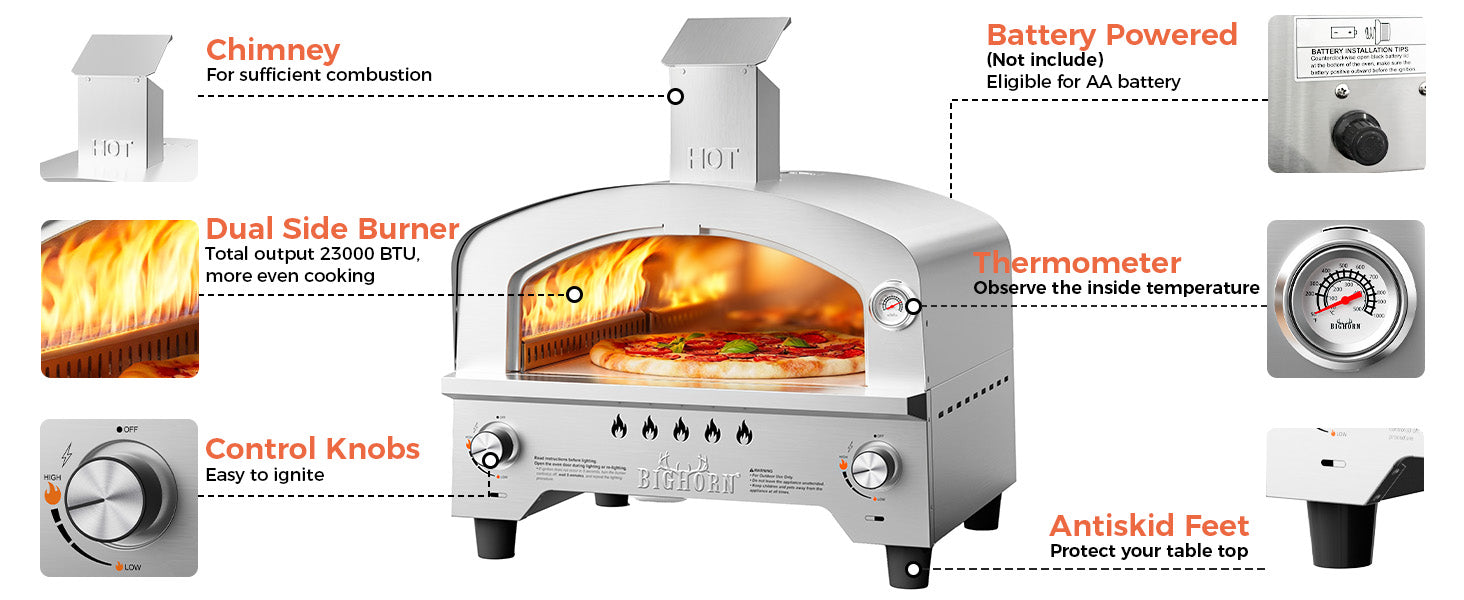- š„Dual Burner System: Even Heat. Full Control. Powered by dual side burners with a total of 23,000 BTU, delivering consistent, edge-to-edge heat across the pizza stone.Two independent control knobs allow you to fine-tune each burner separately ā giving you precision where it matters most.
