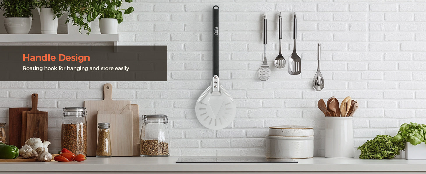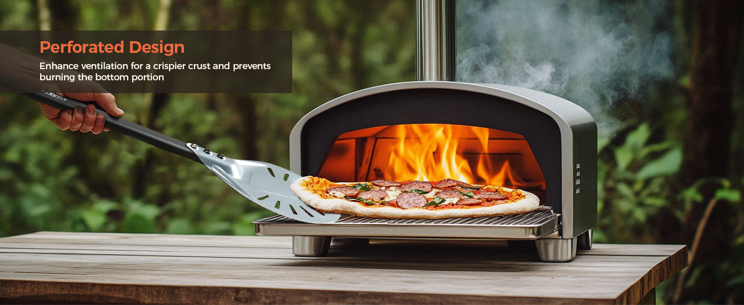 - Optimal Design: This pizza turning peel features a perforated design, enhancing ventilation for a crispier crust and prevents burning the bottom portion that causes fumes and bitter taste of pizza. Make sure your pizza stays perfectly intact during transfer.