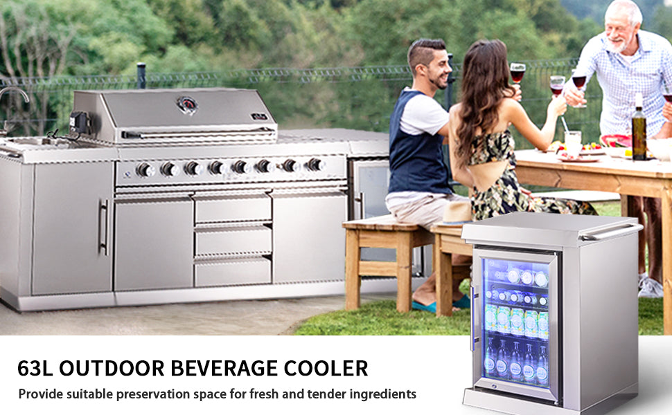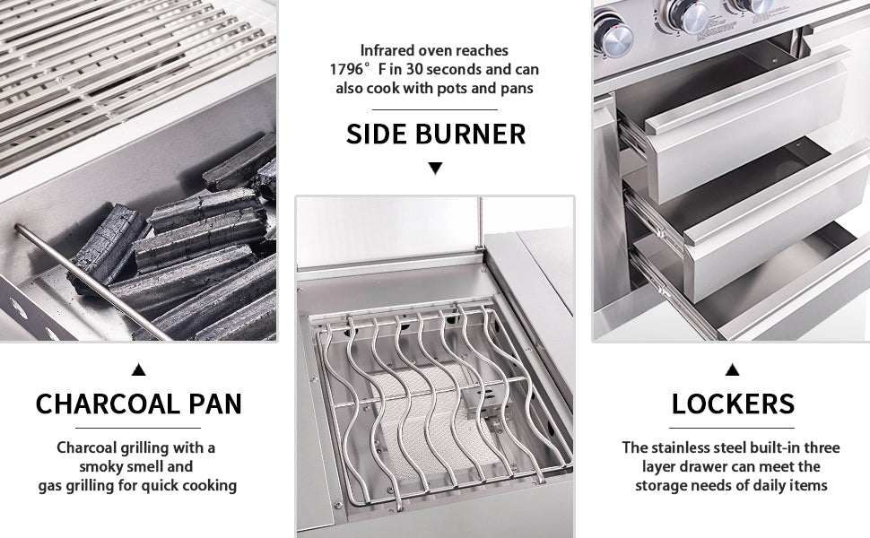 - BIG HORN Outdoor Kitchen Grill included charcoal pan provides additional versatility for your grilling adventures.What Includes: 1xRotisseir Kits ; 1xCharcoal pan; 1xoutdoor refreigerator.