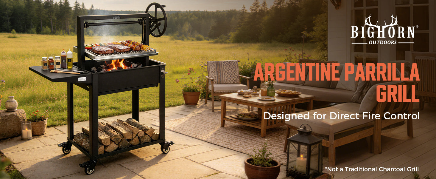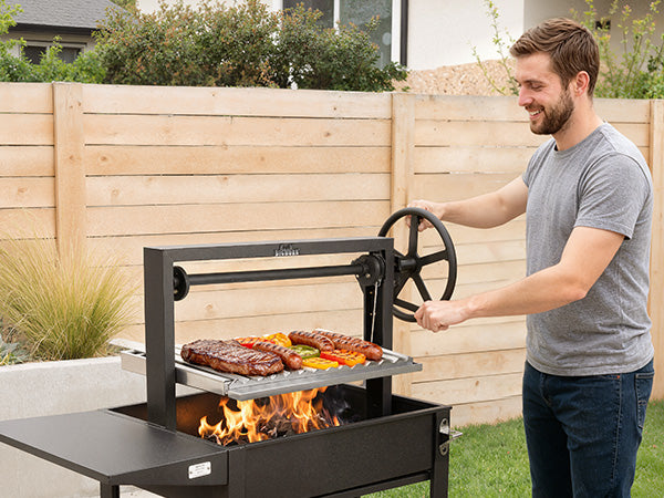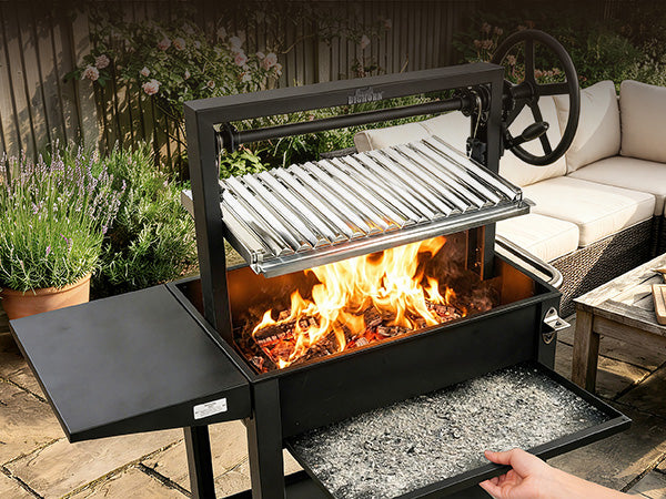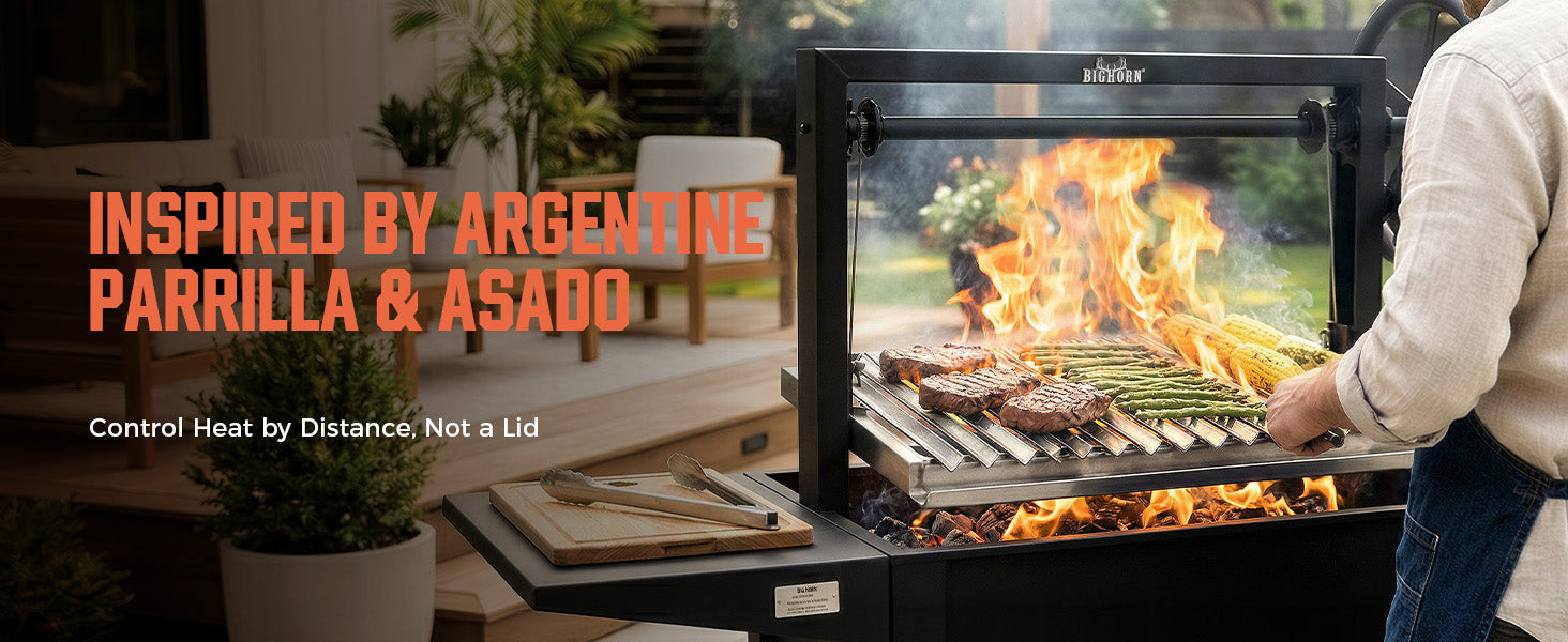 Inspired by traditional Argentine parrilla grills, this Santa Maria system brings professional open-fire cooking to your backyard.Mechanical height control and real wood fire create an authentic grilling experience that gas grills simply can't match.