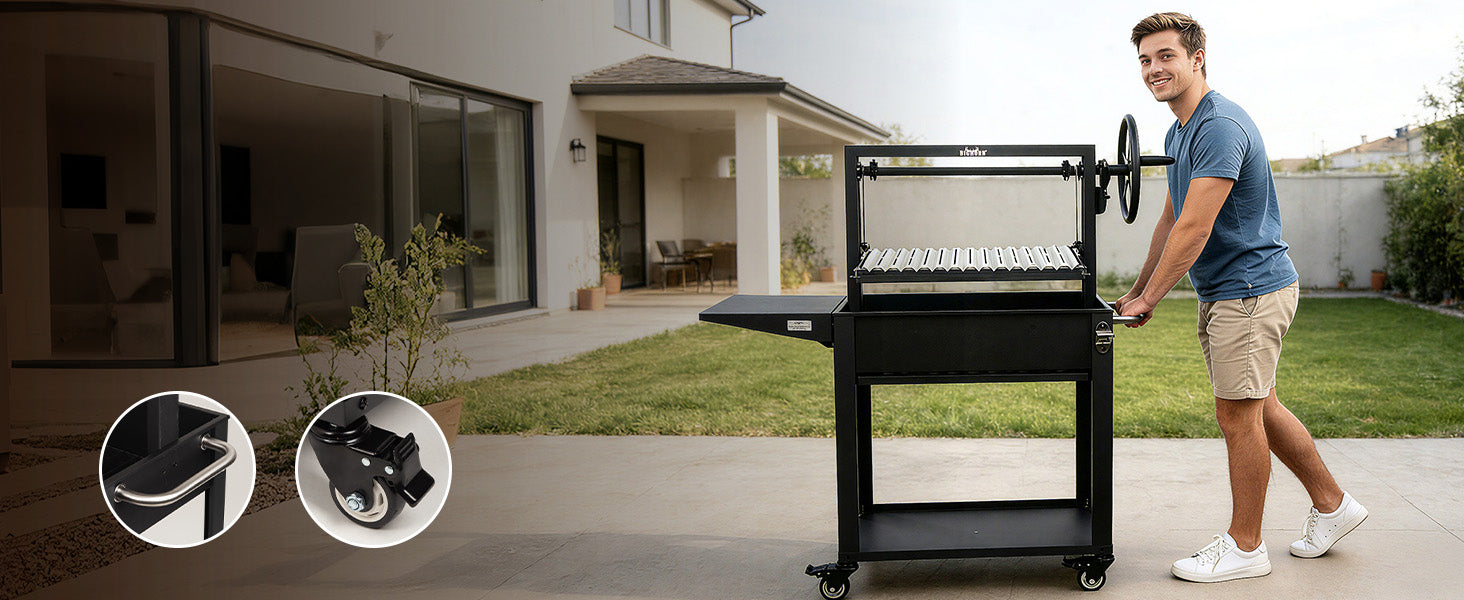 The oversized mechanical hand wheel and steel cable lifting system allow smooth and precise vertical adjustment of the cooking grate.Raise the grate for gentle roasting or lower it for intense searing — heat control happens instantly without adjusting vents or moving charcoal.