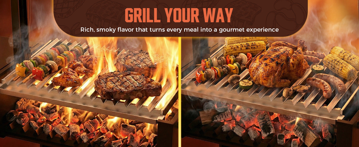 The spacious open fire bed supports both charcoal and hardwood, allowing you to cook with authentic wood-fired flavor.