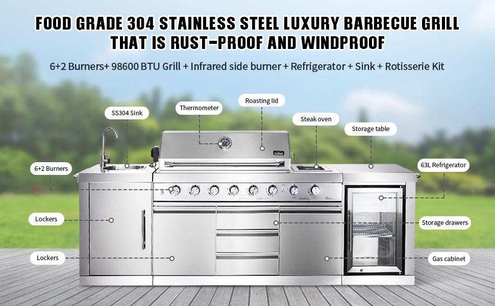 Stainless Steel Kitchen Island, with 6+2 Burners, 98,600 BTUs Gas Grill, Infrared Side Burner, Beverage Refrigerator, Sink, Rotisserie Kit- Big Horn Prime® Series