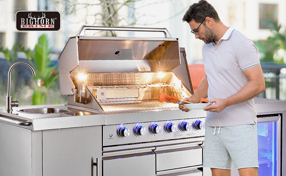 - Diversify your grilling options with the BIG HORN 6+2 Burners Deluxe Stainless Steel Island Barbecue Grill. Boasting 1033 sq. in. of cooking space and a total cooking power of 98,600 BTUs, outdoor kitchen grill has everything you need to craft the perfect feast. Complete with a sink, beverage refrigerator, rotisserie kit, and charcoal pan, this grill elevates your outdoor living space.