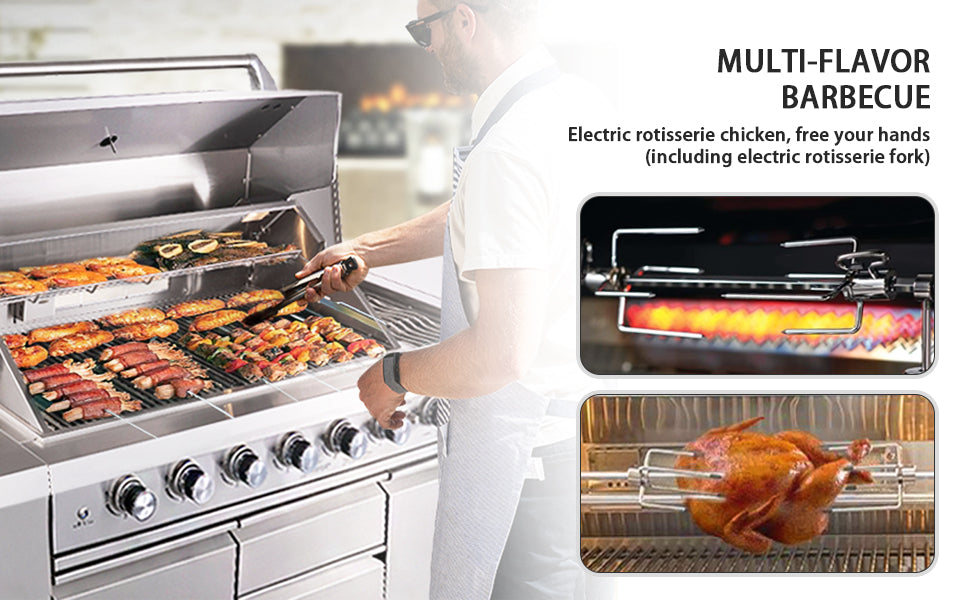 - Enhance your culinary skills with the heavy-duty electric motor rotisserie kit, perfect for roasting chicken to perfection. When it's time for nighttime grilling, the halogen & LED lighting system illuminates the front control panel of gas grill with ease.