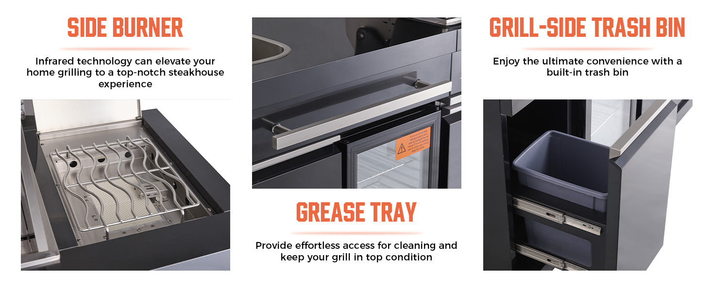 - ✨【Complete Outdoor Experience】This modular outdoor kitchen setup includes an integrated 304 stainless steel sink, a spacious 35L outdoor refrigerator for easy access to chilled beverages and snacks, a grill-side trash bin for quick waste disposal, and a weather-resistant cover for ultimate protection. Enjoy seamless convenience while grilling outdoors